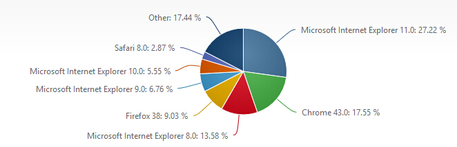 具体到浏览器版本,IE11浏览器以27.22%的份额位居第一位(5月份25.04%),Chrome 43 以17.55%的市场份额位居第二。IE8以13.58%的份额排名第三(5月份为16.05%,排名第二)。Firefox 38以9.03%的市场份额位居第四。