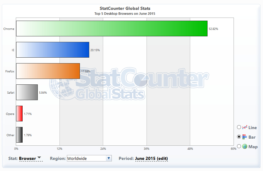 另一份来自StatCounter的 统计数据则显示: Chrome 浏览器名列第一,市场份额52.82%,而5月同期数据为52.96%。 IE浏览器位居第二位,市场份额20.15%,5月份同期数据为19.85%,小幅上涨。火狐浏览器在2015的6月份中占据17.59%市场份额,较5月份额的18.27%出现小幅下降。Safari浏览器市场份额为5.94%,5月份份额为5.23%,小幅提升。第五位的 Opera 市场份额为1.71%,6月数据1.73%。