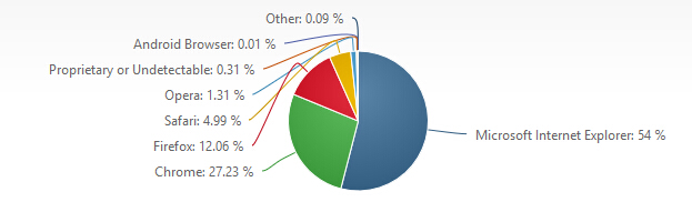 来自Net Market Share 的 数据,6月份,占据全球浏览器排行榜首位的仍然是IE浏览器,总市场份额为54%,较5月的55.83%继续出现下降。Chrome浏览器位居第 二位,最新市场份额27.23%,2015年5月份同期数据则为25.68%,增长1.55个百分点。Firefox火狐浏览器以12.06%的市场份额位 居第三位,而5月份的市场份额为11.7%%,有所上升。