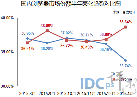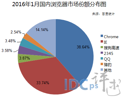 观察图2,可获悉近半年来(2015年8月至2016年1月),国内浏览器市场份额争霸之战异常激烈,IE与Chrome发展态势此消彼长,互不相让,各有输赢。从份额走势来看,Chrome整体向上,形势良好,自去年12月成功夺冠后,份额更是大幅攀升,截至今年1月,涨至38.64%。而IE的份额走势整体向下,发展后劲不足,竞争力不断减弱,截至今年1月,缩至33.74%,较Chrome落后4.90%。