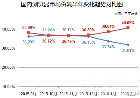 通过图2,可注意到,在2015年9月至2016年2月期间,浏览器Chrome在国内发展形势良好,份额整体呈上升趋势。与之相反,IE发展势态不容乐观,份额被蚕食,降幅越发明显。截至2016年2月,Chrome份额涨至40.62%,IE则跌至31.81%,此时,前者领先后者8.81%。