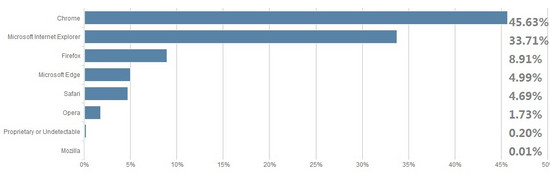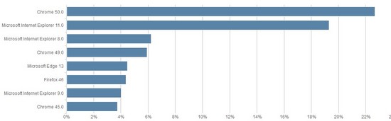 Chrome有三个版本上榜,其中Chrome50排名第一,占额22.65%,Chrome49与Chrome45则分别列居第四和第八,份额分别为5.9%和3.73%;Firefox仅一个版本上榜,占比4.37%;Safari 9.1则位居末位,份额为2.89%。