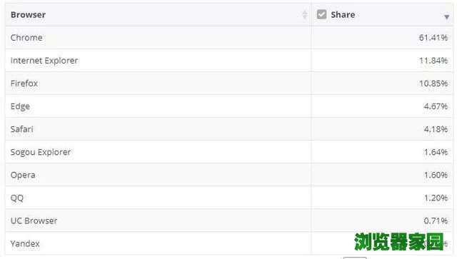 1、根据今年1月份的统计数据显示,Chrome浏览器的占比从上个月的60.57%上升至61.41%,成为当之无愧的世界第一大浏览器。