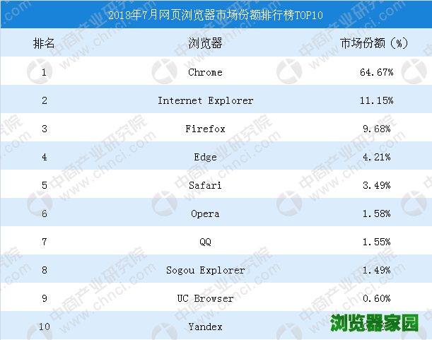 浏览器排行榜2018年7月浏览器市场占比份额排名