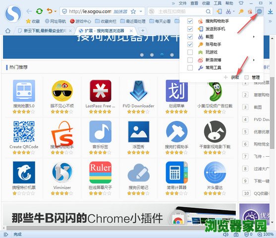 2.点击右上角的“更多扩展”→“获取”,进入搜狗插件扩展页面。