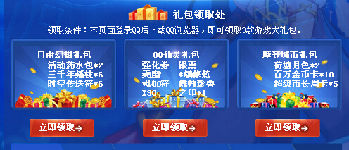 活动期间,在活动页面登录QQ并下载QQ浏览器即刻领取自由幻想、QQ仙灵、摩登城市游戏礼包,领取成功后,系统会随机选取100名幸运玩家赠送10Q币。