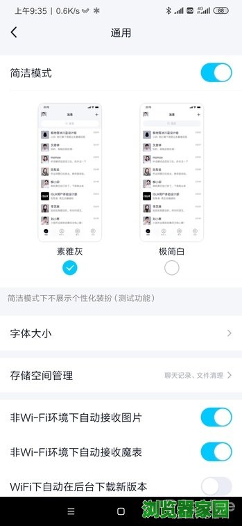 从温馨提示中,可以看到简洁界面模式下,会屏蔽个性装扮,减少系统通知。此外简洁模式还分为了“素雅灰”和“极简白”两种样式。两种模式貌似没多大区别啊。