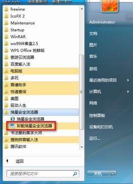 2、我们可以点击开始菜单==卸载瑞星安全浏览器