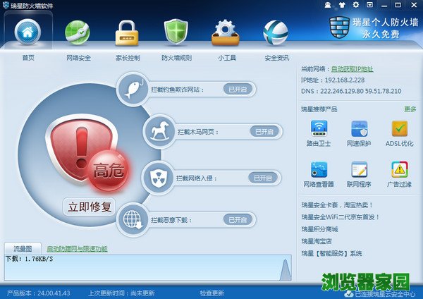 全球浏览器网网站提供瑞星个人防火墙官网下载免费版v24下载地址。瑞星个人防火墙是以瑞星最新研发的变频杀毒引擎为核心,通过变频技术使电脑得到安全保证的同时,又大大降低资源占用,让电脑更加轻便。瑞星个人防火墙最新版主要增加了新的防御保护功能,并优化了网络处理性能,同时致力于为用户提供更好的软件使用体验。有需要的用户可以官网下载体验。