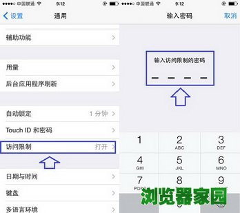 进入通用设置后,我们再选择进入“访问限制”设置,进入后,需要输入手机密码进入,我们输入您之前设置的手机密码,进入即可,如下图所示: