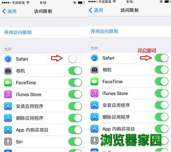 最后我们在iOS7系统的访问限制设置里边允许Safair浏览器,将其开启即可,如下图所示: