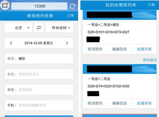 在登陆界面点击“预约抢票”就可开始我们的“约票”之旅了, 进入后就可以根据自己的出行需要选择火车的起始点、时间、席别、车次、乘车人等相关信息,最后填写上自己的电话号码点击“提交预约单”,整个“约票”操作就正式结束了。剩下的就是搜狗手机浏览器在当次火车票开售时,全自动并且可以7*24小时离线为用户抢票。一旦抢购成功,会再次以短信的方式通知你,你只需负责最后的支付环节就好。