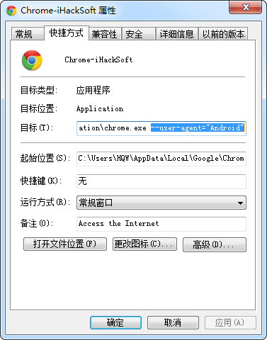 1.新建Chrome快捷方式右击桌面上的Chrome浏览器图标,在弹出的右键菜单中选择“复制”,复制一个图标副本到桌面。右击该副本,选择“属性”,打开相应的对话框,在“目标”文本框的字符后面添加以下语句:“–user-agent=”Android””,如下图: