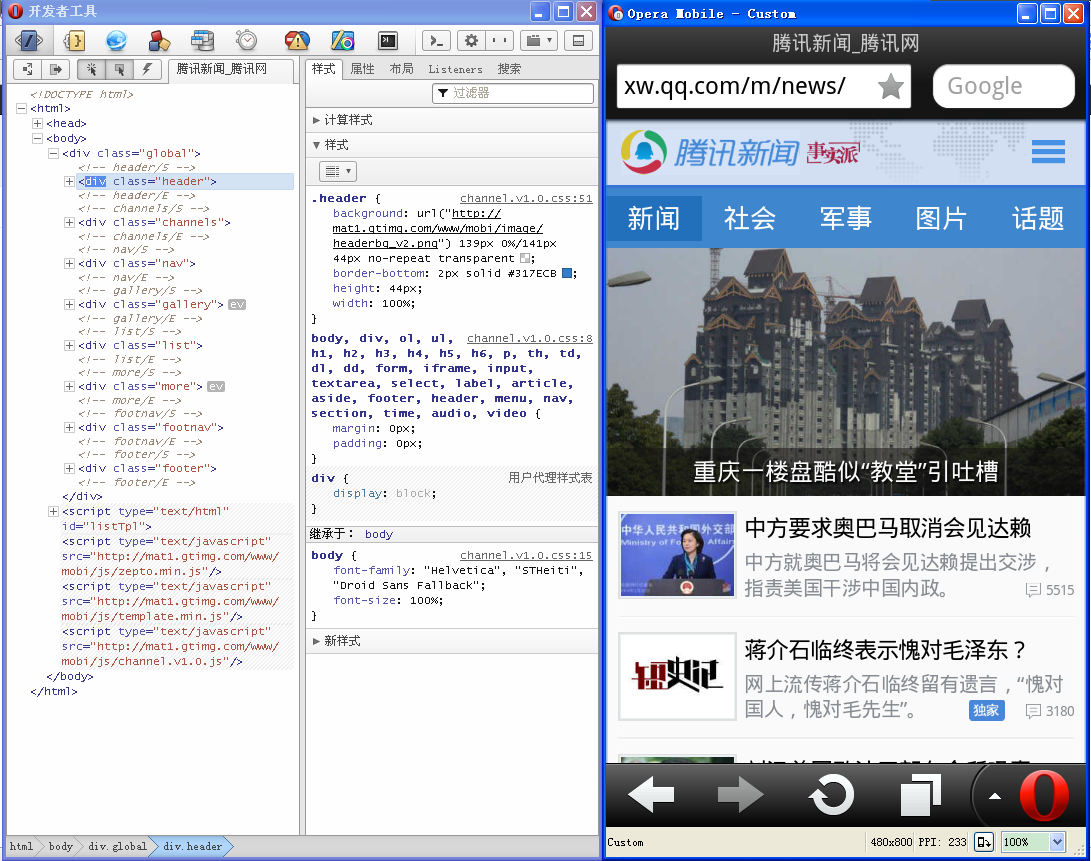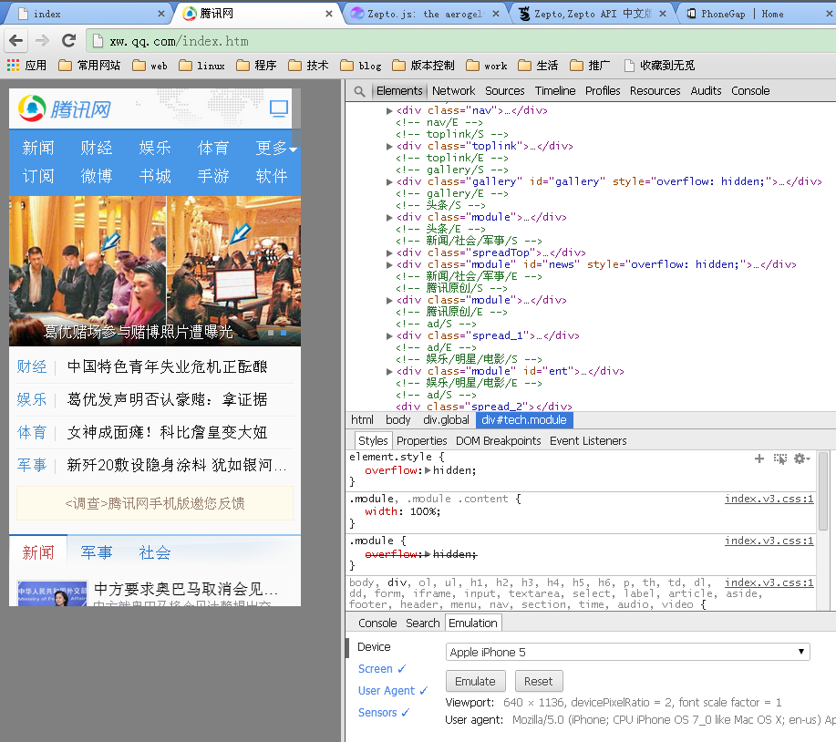 打开仿真后,打开http://xw.qq.com,即可看到如下的手机下的界面