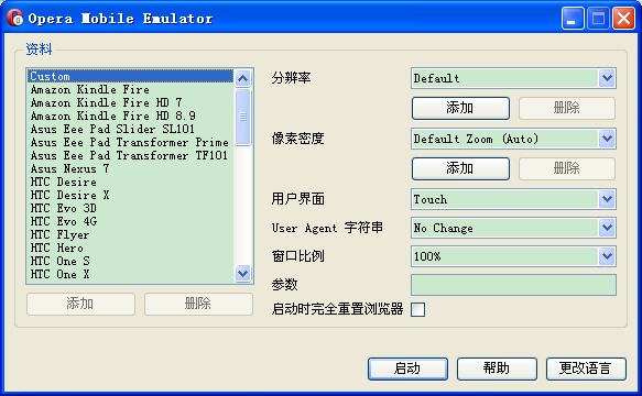 左侧选择平台,右侧选择参数,选择完毕点击启动,如下的几面,用过手机opera的朋友会很熟悉,就是手机opera