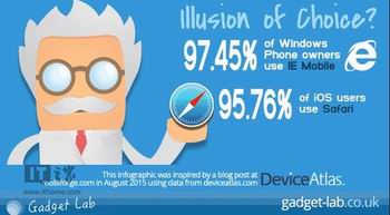 除此之外,按系统来分,97.45%的Windows Phone用户使用移动版IE浏览器,而95.76%的iOS用户使用Safari浏览器,而安卓用户的选择比较多样。