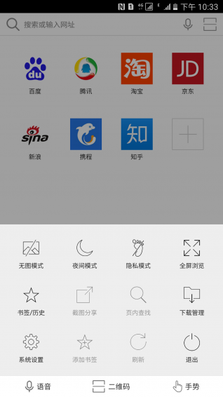 【快捷工具栏】工具栏除了传统的后退、前进、主页外,只要向左滑动,就可以调出二维码、手势、语音工具栏,再滑动一次就可以调整字体大小和屏幕亮度。