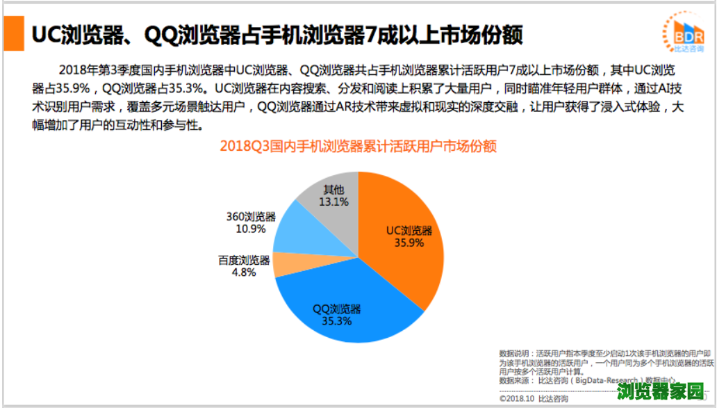 11月5日,移动互联网第三方数据挖掘和分析研究机构比达咨询发布《2018年第三季度手机浏览器产品市场研究报告》。报告显示,通过满足用户多样化的信息需求,手机浏览器在移动互联网的核心入口地位稳固,UC浏览器以35.9%市场份额位居第一,并以92分钟日均用户时长领先。