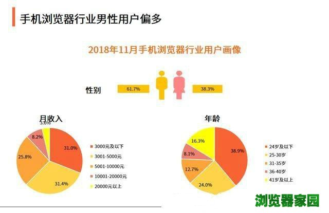 在手机浏览器行业用户画像中,可以明显看到男性占据了61.7%,女性仅为38.3%。在使用人群上,24岁及以下的人群占据了38.9%,25-30占据了24%,30岁以下的使用人群为61.9%,手机浏览器的使用趋于年轻化,月收入5000元以下的人群占据了62.4%。用户年轻化趋势非常明显。