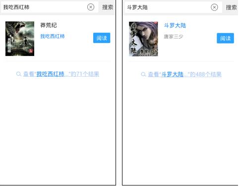 搜狗超全的小说搜索功能,可以根据作者或书名进行搜索。如果搜索作者的话,那么搜索到的第一结果99%是作者当前正在连载的小说,如搜索“我吃西红柿”,得出的结果肯定是目前正在连载的《莽荒纪》;如果搜索书名的话,如“斗罗大陆”,得到的第一结果肯定是《斗罗大陆》而不是《绝世唐门》这个别名为斗罗大陆2的书名。
