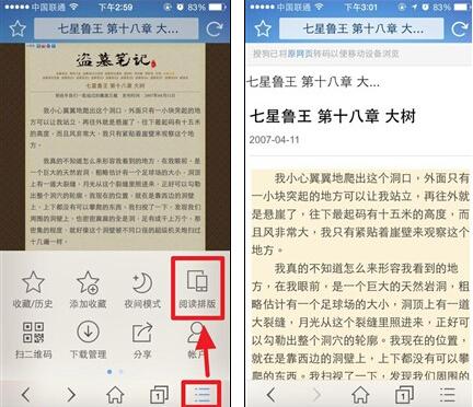 如果你用搜狗手机浏览器再看网页小说有过正常排版字体过小、放大文字又要来回左右移动的窘境的话,那么小编教你一招,让小说排版瞬间变成适合你看的网页。搜狗手机浏览器iPhone版的右下角有一个“阅读排版”功能,只需点一下,整个网页的文字排版就变成正常多了,如下图所示,本来文字小小并且不可自动换行的网页,瞬间变成可以自由缩放字体并且自动换行排版的网页。
