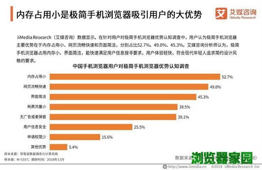 数据显示,2018年中国手机浏览器用户规模达到6.81亿,行业渗透进一步加强。随着行业的发展和成熟,极简浏览器的推出满足了用户对小内存的需求。iiMedia Research(艾媒咨询)数据显示,69.5%的受访用户愿意使用极简浏览器,另有52.7%认为内存占用小是其最大优点。