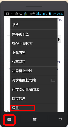 打开任意一网页后,点击手机上的“菜单键”,弹出浏览器菜单项,用手指肚向上滑动菜单,在最下方找到“设置”项单击。