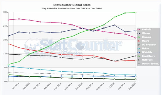 数据显示,UC浏览器目前全球市场份额达11.1%,位居第三方手机浏览器榜首。如果算上系统原生浏览器,则Chrome、iOS的Safari和Android原生浏览器分别以29.76%、21.94%和18.87%分别名列全球最流行浏览器前三名,再之后就是UC浏览器。