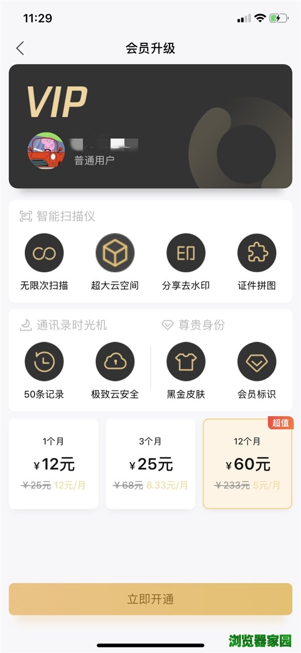 无限次扫描,支持OCR文字识别;1024MB云空间,可存约2000张扫描件;扫描件分享无水印;证件拼图,可自动拼接证件正反面,支持身份证、户口本等9种类型;可保存50次历史备份记录;云安全保护,包括数据加密存储与资料隔离存储;专享黑金皮肤以及会员标识等。