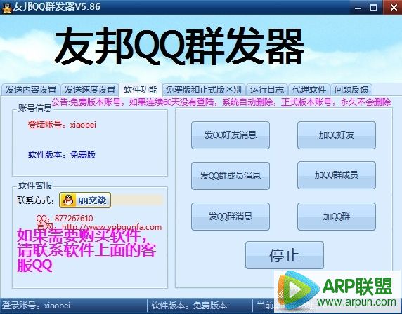 友邦QQ群发软件由友邦工作室开发研制,是一款针对QQ群发的软件。其软件功能强大,操作简单,人性化的设计理念,操作页面用户体验都非常的简洁,容易上手,完全的傻瓜式的操作模式,支持最新QQ2013进行群发,稳定性强,支持QQ好友,QQ群,QQ群成员,支持加好友群发,支持搜索QQ好友功能,支持文字,图片,表情,链接内容发送。软件体积小,不占用电脑内存,CPU,友邦软件力争行业性价比最优秀的软件商。