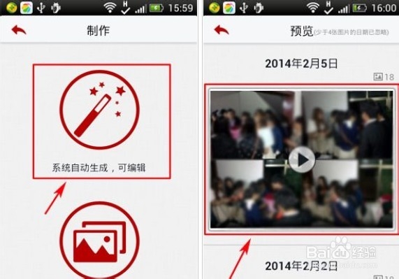 2)在进入制作界面,点击“系统自动生成,可编辑”按键,然后在预览界面,选择一个视频。注:同时大家也可以选择自己手动制作视频。