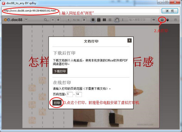 软件可以帮助用户免费下载DOC88网上的文档,或者打印文档。可下载后打印,下载文档到电脑后,使用本机安装的OFFICE软件或PDF阅读器进行打印,也可以在线打印,输入打印的页码范围,如果电脑安装了虚拟打印机,可以点击打印按钮。