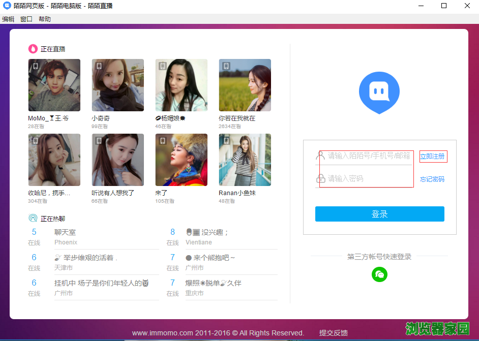 全球浏览器网提供陌陌电脑版官方下载2018免费下载安装。陌陌电脑版2018版是一款基于地理位置的移动社交工具,你可以通过陌陌认识周围的陌生人或者朋友,免费发送语音、信息、图片、地图位置。陌陌电脑版还可绑定第三方应用(新浪微博、人人、豆瓣),方便人与人之间更便捷和及时的联系。