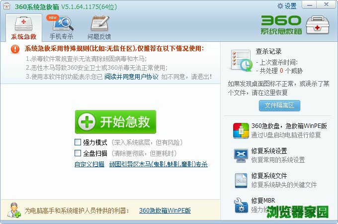 全球浏览器网网站提供360急救箱64位官方下载2018最新版免费下载安装。360急救箱(原顽固木马专杀大全)包括各种流行木马的查杀工具,可以快速、准确地查杀木马。包括犇牛、机器狗、灰鸽子、扫荡波、磁碟机等在内的各种木马,都可以用360急救箱进行查杀。要查杀木马,用360急救箱!360安全卫士已经搭载新一代云查杀引擎,拥有史上最强木马查杀能力。杀木马、防盗号、免费杀毒,安全上网从360开始。当电脑感染木马,导致360无法安装或启动时,用本软件查杀。欢迎有需要的用户官网下载体验。