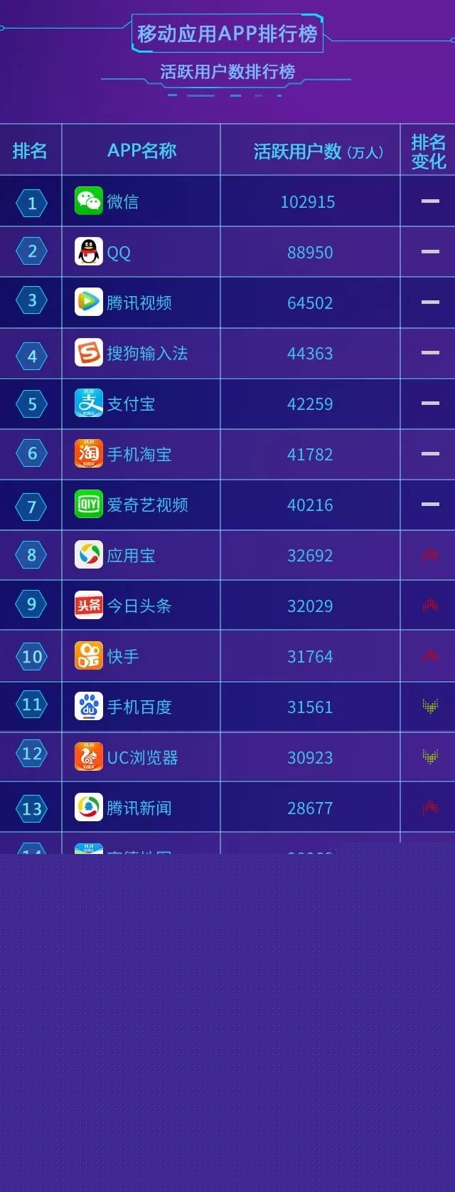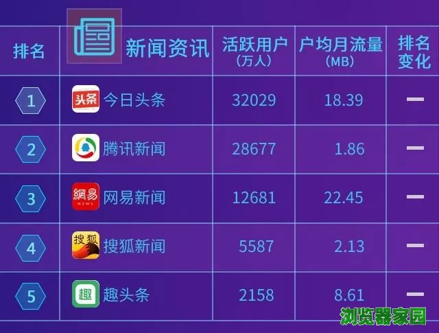 曾经,移动浏览器在我们的智能手机终端中占据重要位置,但随着信息获取渠道的丰富、搜索入口的增多、资讯类APP推送算法的优化等,越来越多用户选择通过其他信息源“订阅推送”取代浏览器内的“主动搜索”。在本期活跃用户数总排行榜中我们也可以看出:手机百度、UC等移动浏览器APP排名有所下滑,今日头条、腾讯新闻等资讯平台的用户活跃度排名上升。
