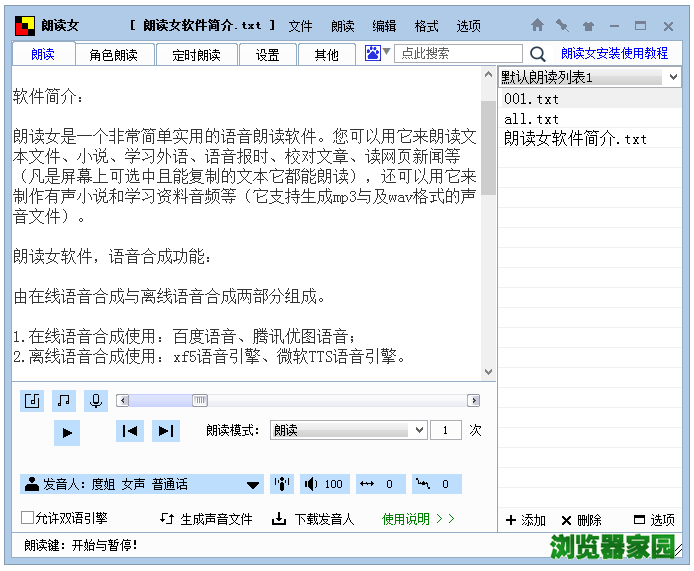 全球浏览器网网站提供朗读女语音朗读软件免费下载电脑版v8.97下载地址。朗读女是一个非常简单实用的语音朗读软件。您可以用它来朗读文本文件、小说、学习外语、语音报时、校对文章、读网页新闻等(凡是屏幕上可选中且能复制的文本它都能朗读),还可以用它来制作有声小说和学习资料音频等(它支持生成mp3与及wav格式的声音文件)。有需要的用户可以官网下载体验。