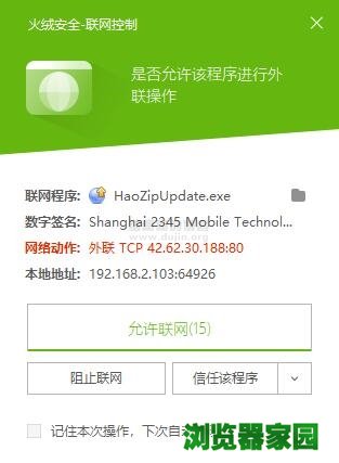 在火绒的防护中心开启联网控制,阻止“好压haozip”联网。因为之前设置为手动升级了,所以需要点击下“检查新版本”来让火绒屏蔽。