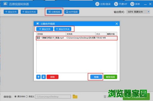1.打开视频转换器,点击界面上的“分割视频”功能,然后选择“添加文件”或“添加文件夹”把视频添加上去,接着点击选中视频,再点击“剪辑”按键。