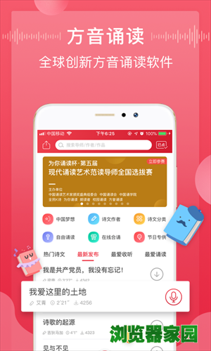 全球创新方音配乐诵读软件,方音诵读app为你提供海量素材,也可自写自读,邀请他人诵读,或用普通话,或用方言。朗诵能提高我们对文本的理解能力、鉴赏能力和艺术修养,也能提升我们的语言表达能力。