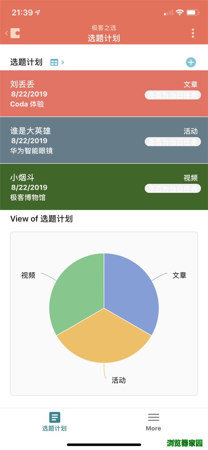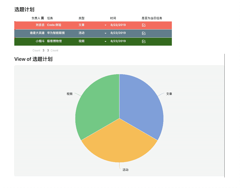 光是「丰富」,自然还谈不上什么效率。Coda更强大的是它的显示视图功能,根据不同的需求,你可以将表格切换成不同的展示方式:卡片(适合查看每个成员的任务)、日历(适合查看近期计划)、图表(适合对比不同项目的进度)......
