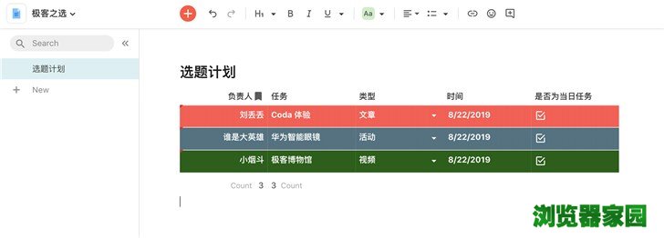 用具体例子来说明会更加直观。比如极客之选日常的选题计划:每个成员有当日的任务(用Text表现);任务类型是文章、视频拍摄、直播,或者日常运营(用Select表现);有截止日期(用Date表现)......每一个类型的项目都有相应格式去表现,利用这些功能可以构建一个丰富的表格。