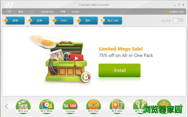全球浏览器网网站提供万用影音转换器下载官网电脑版免费安装地址。万用影音转换器Freemake Video Converter 拥有非常友好的界面,即使你不是电脑达人,也能轻易使用,Freemake Video Converter支持多个格式文档输出,支持专为多种设备提供格式,如:Android,Apple,You tube等。