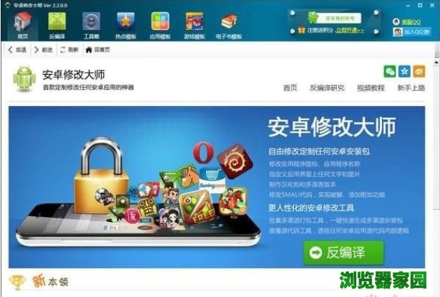 全球浏览器网网站提供安卓修改大师官网下载电脑版安装地址。安卓修改大师可以让您轻松将任何APK安装包进行反编译,替换应用程序界面上的任何文字和图片,并且通过代码级别的修改,实现汉化、破解、功能增强,甚至可以在任何的界面添加自定义的代码和功能。有需要的用户可以官网下载体验。