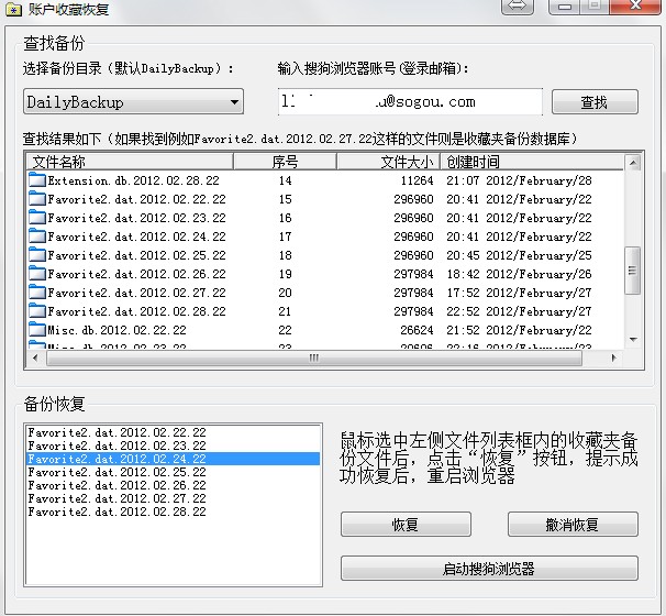 (2)在打开的界面中,输入自己的搜狗浏览器通行证账户,也就是登录浏览器时的邮箱地址,(例如xxx@sogou.com 、xxx@qq.com 、xxx@163.com 等,需要注意的是,本工具不支持直接使用QQ号登录的账户)。输入账户后,点击“查找” 在查找结果列表内,可以找到类似于“Favorite2.dat.2012.02.26.18” 这样 命名的文件,文件名后面的数字表示日期,代表的是这个文件的备份日期。