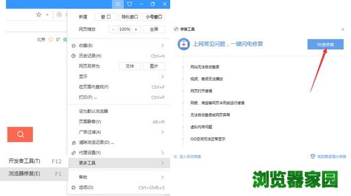 2. 浏览器修复工具 如果您在兼容模式下访问仍然有问题,可能是由于您的网络问题导致网页没有被完全下载下来。可以点击浏览器的修复工具(右上方菜单中点击“帮助”,在其中选择“修复浏览器”。或者按快捷键F1),执行修复后再打开浏览器试下。