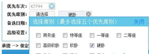 6.在优先席位栏选择我们想要的作为,比如硬座、硬卧等。