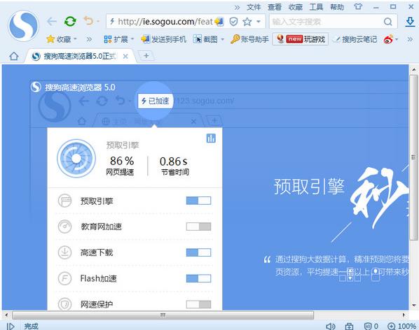 2015搜狗高速浏览器采用多级加速机制,能大幅提高您的上网速度,独创的预取引擎技术,精准预测下一步访问的网页并提前加载,打开网页至少快一倍,引爆上网速度革命;精心打磨的时尚简洁界面,上百个细 节体验优化,给您更极致的视觉感受,更畅快的上网体验。