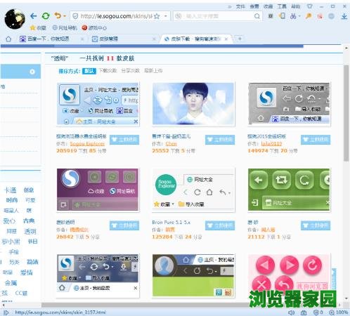 3、来到搜狗浏览器的皮肤中心后,我们在右边的搜索框中搜索“透明”,在搜索之前将搜索框旁边的“主题”修改为“皮肤”,如下图所示: