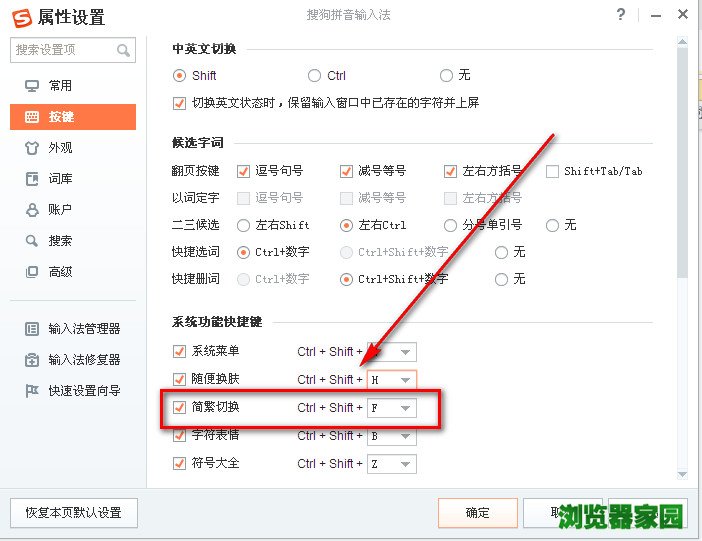 搜狗输入的默认快捷键是:Ctrl+shift+F