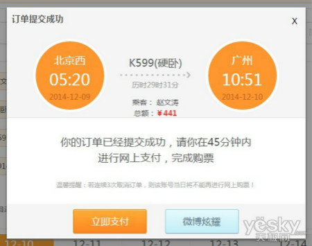 购票成功后,UC抢票专家会提示用户立即支付,并能到微博进行炫耀